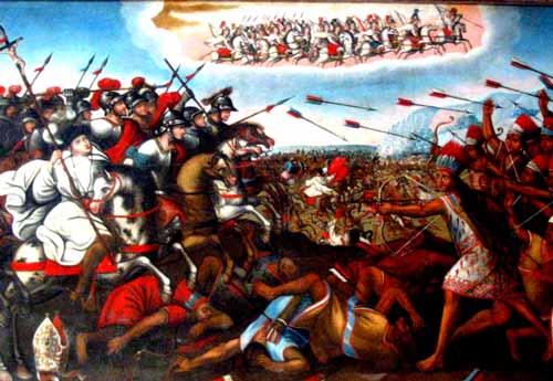 Tak właśnie rozpoczęli jeźdźcy, strzelali ze swych arkebuz, atakowali, owi żołnierze zaś zaczęli zabijać Indian jak mrówki; Ci byli przerażeni widokiem arkebuz, hałasem dzwonków i broni, i tym, czego ludzkie oczy nigdy nie oglądały: placem Cajamarca wypełnionym ciałami Indian. I wzajem się zabijali, następując na leżących i tłoczących się pod naporem, konie padały: tak wielu Indian zginęło, że nie zdołano ich zliczyć. Spośród Hiszpanów zginęło z własnej winy pięciu, ponieważ Indianie byli zbyt przerażeni, i żaden nie ośmielił się ich zabić -