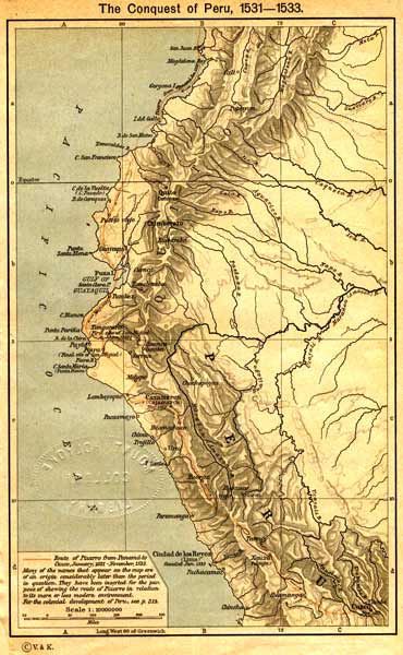 Reprodukcja starej mapy Peru i przebieg konkwisty: