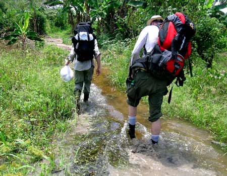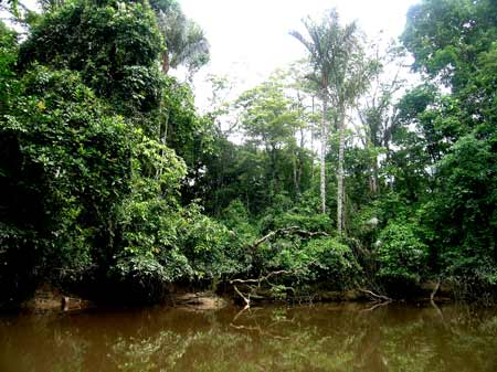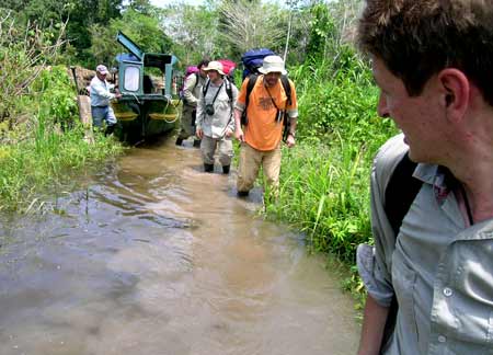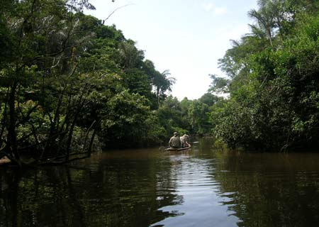 Łódź przewozi nas kilkanaście kilometrów różnymi rzeczkami wgłąb lasu. Tam wystawia nas na brzeg obok niewielkiej ścieżki, po czym odpływa. Dalej do dżungli nie da się popłynąć motorówką a jedynie małymi dłubankami.