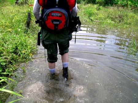 Musimy przenieść siebie oraz sprzęt kilometr ścieżką do wioski, gdzie czekają na nas "tigres" (dwaj lokalni myśliwi, którzy będą nam towarzyszyć ze względu na łowiecki charakter wyprawy). Do osady liczącej raptem sześć chałupek wkraczamy w różowych promieniach świtu. Czujemy się niczym żołnierze z filmu o wojnie w Wietnamie.