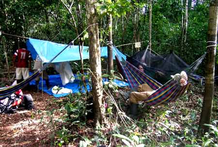 Popołudniem docieramy do celu podróży. Zakładamy obóz w miejscu często wykorzystywanym jako baza przez lokalnych myśliwych. Tigres z Cesarem błyskawicznie stawiają obozowisko - plastikowa płachta jako dach, moskitiery, hamaki, ognisko.