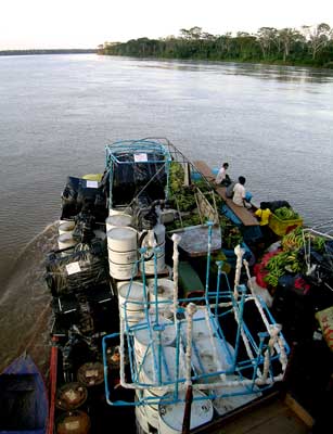 Przez ten czas zdążyliśmy się nasycić po uszy (i na resztę życia) widoczkami brzegu dżungli z rzeki, oraz wypić cały dostępny alkohol. To ostatnie było dziełem prawie zdawałoby się, niemożliwym. Na nasze statkowe zapasy na długi rejs mieliśmy bowiem dużą ilość whisky, magazynek statkowego baru piwnego, oraz kupione przeze mnie "na czarną godzinę" kilka literków bimbru, który odlano z kanistra w porcie w Pucallpie do butelek po wodzie mineralnej. WYPILIŚMY WSZYSTKO. Skończyły się zapasy wolnocłowe, potem wykończono wszystko, co posiadała właścicielka baru na trzecim pokładzie, a na końcu poszedł i bimber, na który początkowo wszyscy kręcili nosem.