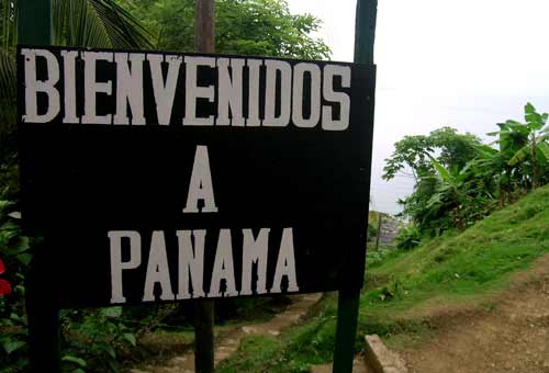Mniej więcej w południe przechodzimy granicę. Na szczycie najwyższego jak do tej pory wzgórza natrafiam (idę pierwszy, Bartosz idzie wolniej za mną) na słupek graniczny i posterunek panamskiej gwardii. Żadnych problemów ze strony mundurowych. Każą wpisać się do grubej księgi. Gdy nadchodzi Bartosz, robi mi zdjęcie na tle znaku "Witamy w Panamie".
