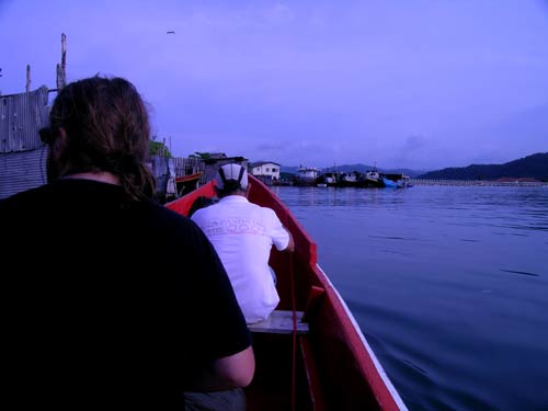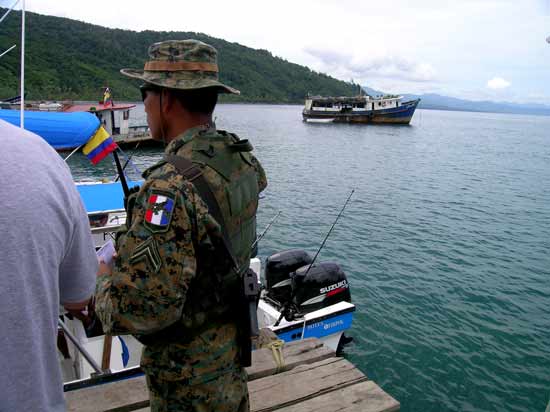 Dowódca załatwia nam dalszy transport na łódce rybaka, który płynie właśnie do Obaldia. Za 5 dolarów zabiera nas ze sobą. Po zejściu na ląd oczywiście czeka na nas wielka zgraja policjantów, którzy mają dużo pytań do zadania. Po zakończeniu spowiedzi dokładnie przeszukują zawartość naszych plecaków. Próby przechodzimy pozytywnie jak przystało na wzorowych obywateli i po chwili jesteśmy wolni.