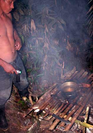 To, czego się nauczyłem przez te 5 dni w dżungli z Juanem nie da sie streścić w paru zdaniach, jednak była to naprawdę niesamowita lekcja życia i to nie tylko za sprawą samej dżungli, ale również faceta, z którym mieliśmy szczęście się do niej wybrać. Wszystko było przygotowane bardzo profesjonalnie. Juan zabrał ze sobą trzech pomocników, których praca podczas tego wypadu okazała sie nieoceniona. Oczywiście, najważniejsza jest woda i jedzenie. O jedzenie najłatwiej zapolować w wodzie, więc ryby były podstawą naszego wyżywienia. A z wodą nie ma w dżungli problemu, bo rzeki płyną gęsto.
