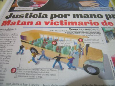Obecnie trwa wojna maras (gangów, głównie MS13, M18) z komunikacją miejską. Kierowcy, którzy nie zapłacą haraczu za przejazd przez dzielnice kontrolowane przez maras, są zabijani po przejechaniu paru ulic. Likwidują ich sicarios na motorach. Podjeżdżają pod boczną szybę kierowcy i oddają kilka strzałów. Przeważnie trafiają w głowę. Od początku roku do wczoraj, jak przeczytaliśmy w gazetach, zabito 126 kierowców autobusów i 35 pomocników (bileterów).