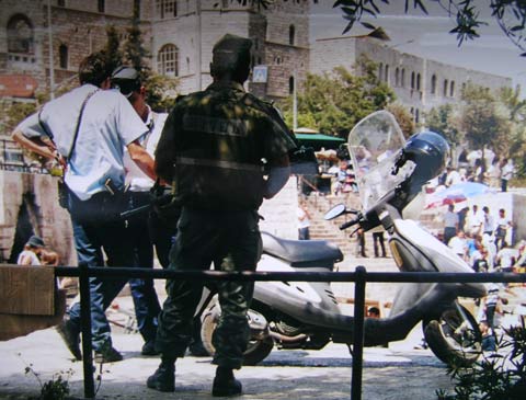 Chudy Palestyńczyk zamiata plac. Ortodoksyjni Żydzi w czarnych tradycyjnych szatach, z długimi pejsami, studiują księgi. Wkoło policja, żołnierze, uzbrojona straż.