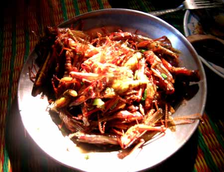 Koleś nam tłumaczy, że facet chciał kogoś zabić, więc trzeba go od tego powstrzymać. Jakie szczęście, że jednak nie wybrałem się samotnie do Pailin, tak sobie myślę. Czekamy na policję, bo podobno już jedzie na motorach. W miedzyczasie sąsiedzi przynoszą upolowane świerszcze, czyli koniki polne. Nawet nie wiemy kiedy uwijają się z ich przyrządzeniem i niebawem wspólnie delektujemy się ich smakiem. Są podobne do tych, które jedliśmy w Bangkoku, tyle tylko, że świeże, nie ususzone.