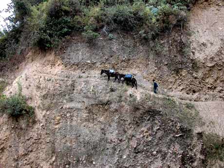 Trzeci dzień jest najtrudniejszy na naszej trasie, dlatego obydwoje mamy lekkiego stracha. Okazało się, że był naprawdę ciężki. Najpierw zaczyna sie od masakrycznego zejścia w dół, aż do samej rzeki. Tam spożywa sie posiłek i dalej do góry. Nasz Mula Manager, stwierdził, że będziemy iść około 5 godzin. Miałem cholernie mało wody, więc prawie w ogóle nie piłem, ponieważ chciałem przyoszczędzić na później. Jednak podejście było naprawdę mordercze, słabłem z minuty na minutę. W plecaku miałem jedną pomarańczę i nieco wody. Mula Manager nas wyprzedził, więc nie było mowy o posiłkach.